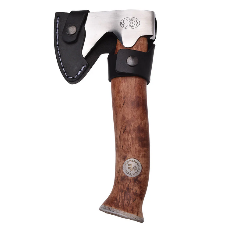 Unna Áksu – det betyder liten yxa på samiska. Vår minsta jaktyxa med huvud i rostfritt stål passar utmärkt för jägaren att bära med sig. Handgjort skaft i älgben, renhorn och oljad masurbjörk. Alla skarvar är ifyllda för att yxan ska vara lätt hålla ren. Yxan levereras med ett diamantbryne och ett matchande hölster i nötläder.