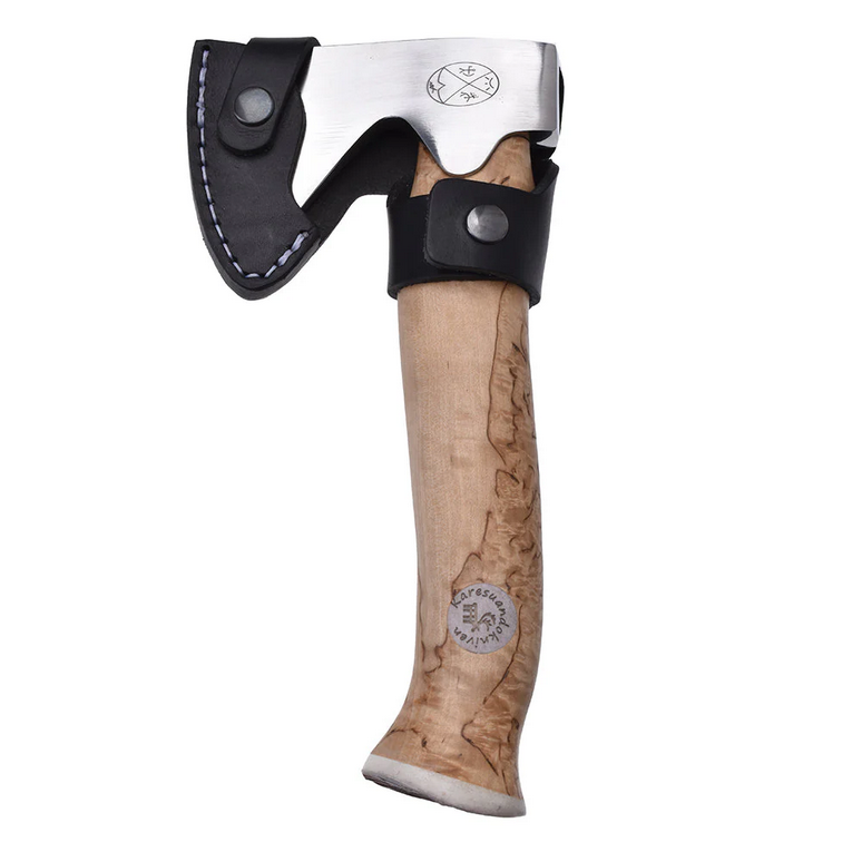 Unna Áksu – det betyder liten yxa på samiska. Vår minsta jaktyxa med huvud i rostfritt stål passar utmärkt för jägaren att bära med sig. Handgjort skaft i älgben, renhorn och masurbjörk. Alla skarvar är ifyllda för att yxan ska vara lätt att hålla ren. Yxan levereras med ett diamantbryne och ett matchande hölster i nötläder.
